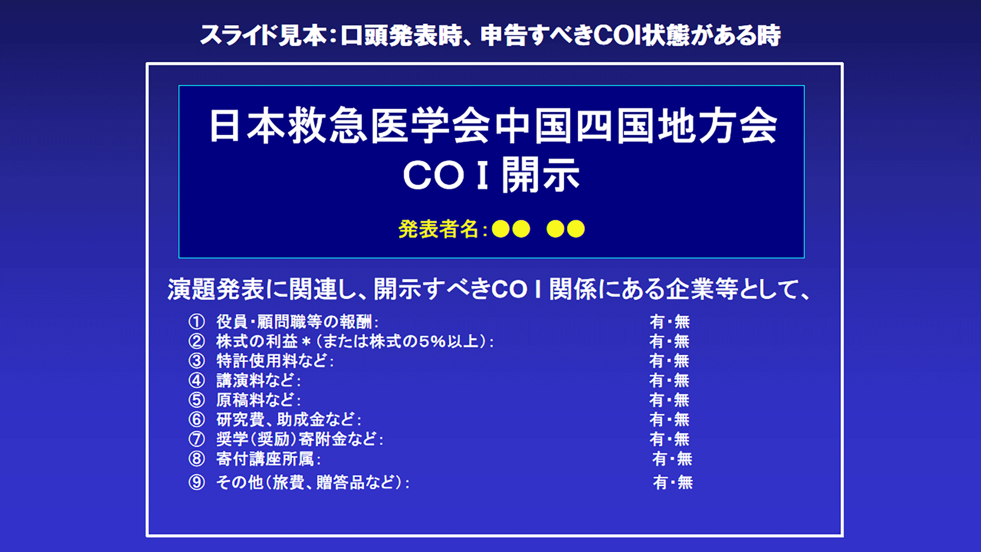 開示方法については発表スライドのトップページ(もしくは、演題名・演者紹介の次ページ)に、下記の参考書式をもとに利益相反(COI)状態を記載した画面を必ず表示してください。